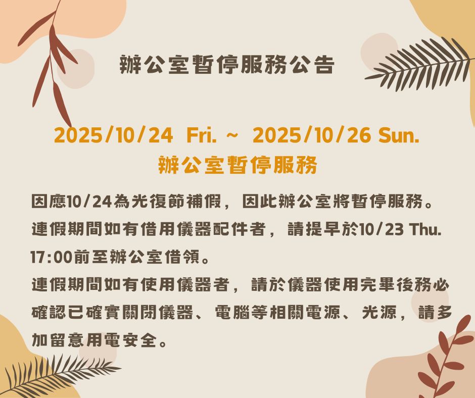 【公告】2025/10/24 (五)~10/26(日)因應光復節連續假期,核心實驗室辦公室暫停服務,核心實驗室儀器照常預約使用。